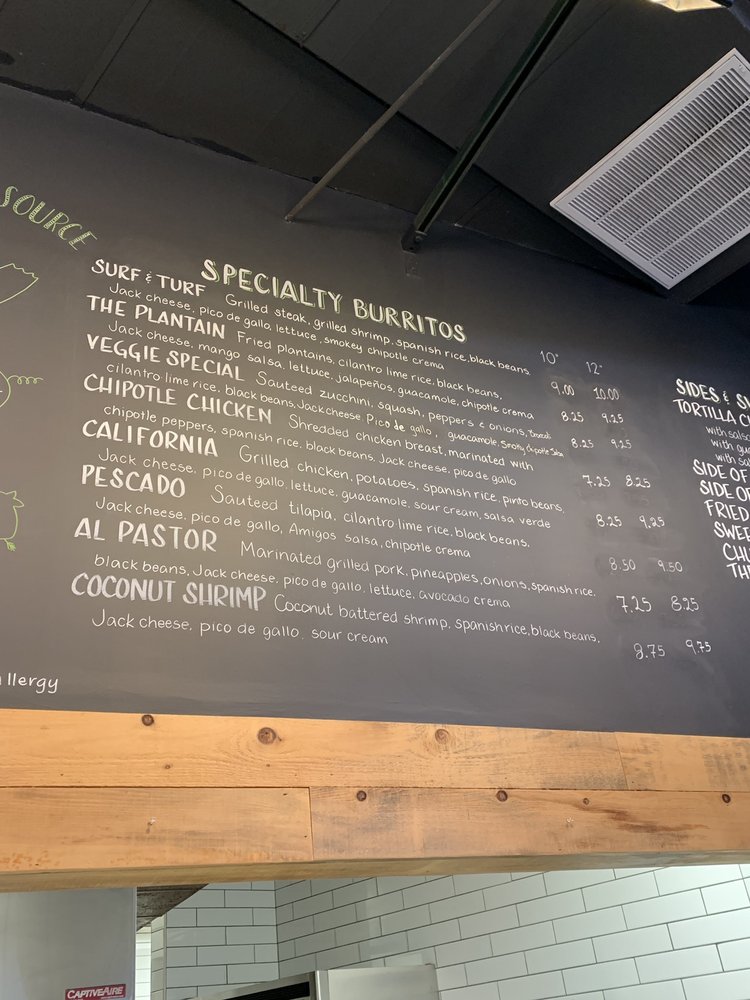 Fried plantains, cilantro lime rice, black beans, Jack cheese, mango salsa, lettuce, jalapenos, guacamole, and chipotle crema.